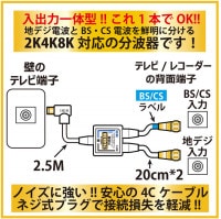 地デジとBS/CSの電波に分ける4K8K対応のTV接続用入力/出力ケーブル付きアンテナ分波器。入力ケーブル2.5M+出力ケーブルは邪魔にならない20cm仕様。ケーブルはノイズに強いS-4C-FBケーブル採用